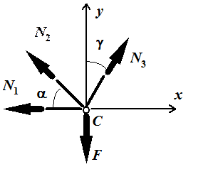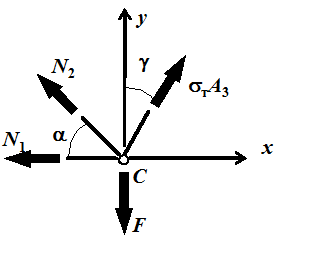 Поскольку усилие в стержне 3 уже известно, задача становится статически определимой и усилия в стержнях 1 и 2 находим из уравнений равновесия узла