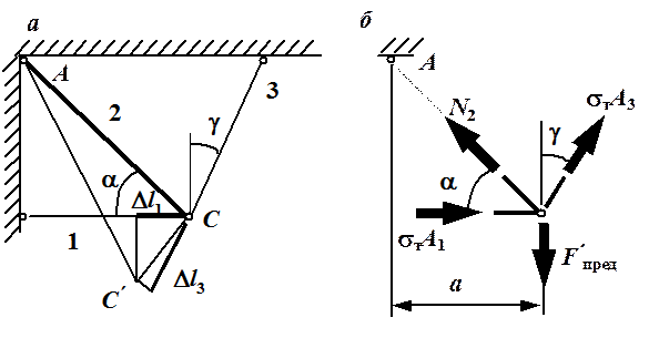 В качестве примера рассмотрим два варианта предельного пластического состояния в нашей задаче. Согласно первому варианту допустим, что напряжения в стержнях 1 и 3 равны
