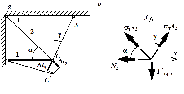 Во втором варианте предельного пластического состояния напряжения в стержнях 2 и 3 равны sт, а первый стержень работает в упругой стадии. Планы сил и перемещений показаны на рис. 1.21. Запишем уравнение предельного равновесия для узла С (такое уравнение равновесие, в которое не входит неизвестное усилие N 1):