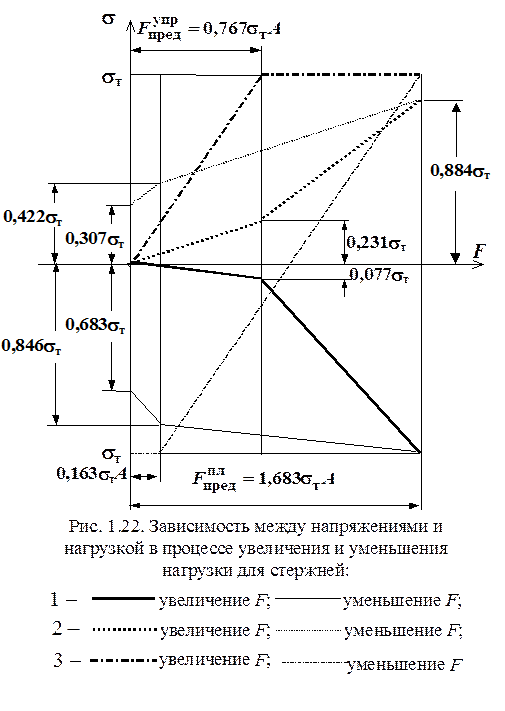 , поэтому линии разгрузки каждого стержня будут направлены параллельно линиям упругого нагружения (левый участок диаграммы). Если одно из напряжений при разгрузке достигнет величины