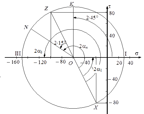 Строим круг напряжений (рис. 2.8). Изображаем систему координат