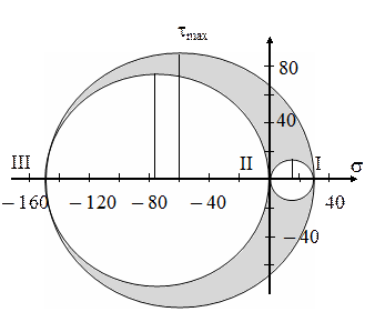 Графическим изображением пространственного напряженного состояния служат три круга напряжений. Точки каждого круга изображают площадки, которые перпендикулярны одной из главных площадок. Точки затемненной области изображают всевозможные наклонные площадки. Изображение напряженного состояния в виде трех кругов Мора используется в качестве иллюстрации, а не в качестве способа вычисления, поэтому в расчетной работе данный рисунок можно выполнить в меньшем масштабе и не обязательно на миллиметровке. Круги напряжений для рассматриваемого напряженного состояния показаны на рис. 2.9. Круг напряжений на рис. 2.8 соответствует площадкам, перпендикулярным плоскости чертежа (перпендикулярным второй главной площадке). Из рис. 2.9 видно, что максимальное касательное напряжение
