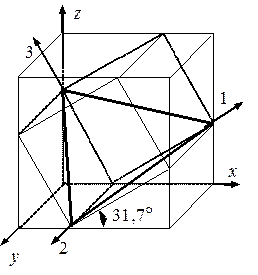 Положения опасных площадок согласно третьей и четвертой теориям приведены на рис. 2.10, 2.11. По площадке рис. 2.10, выделенной жирным контуром, действует максимальное касательное напряжение. Эта площадка перпендикулярна к площадке 2 и наклонена под углом в 45° к площадкам 1 и 3. Выделенная площадка рис. 2.11 соответствует четвертой теории прочности. Она равно наклонена ко всем трем главным площадкам.