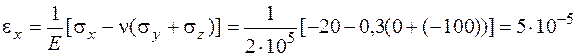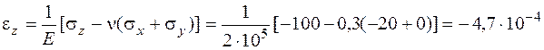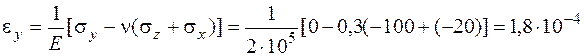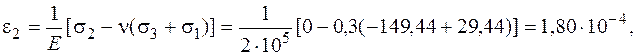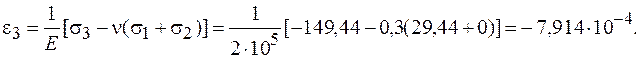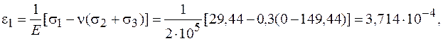 Определение деформаций в точке. Деформации являются упругими и можно применять обобщенный закон Гука, так как вычисленные выше эквивалентные напряжения меньше предела текучести: