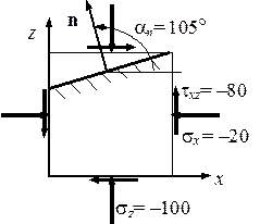 Изобразим элемент в виде плоского рисунка (рис. 2.4), на котором укажем систему координат. Покажем наклонную площадку и внешнюю нормаль к ней, отметив штриховкой внутреннюю сторону площадки. Система координат позволяет обозначить напряжения: