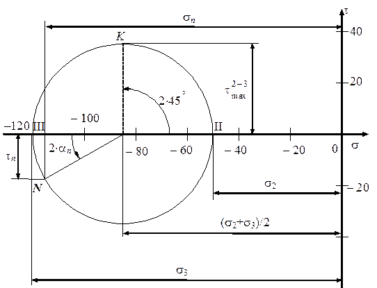 Круг напряжений для заданного плоского напряженного состояния показан на рис. 2.18. Координаты точки