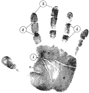 Задание №1. Изучите изображение отпечатка, определите элементы рельефного строения кожного покрова ладонной поверхности руки и назовите основные зоны: