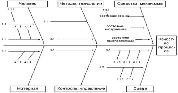 Причинно-следственная диаграмма. Данная диаграмма представляет собой наиболее эффективный метод проверки различных гипотез о потенциальных причинах проблемы качества. Идея диаграммы состоит в установлении взаимосвязей между показателями качества – следствием – и воздействующими на него факторами – причинами. При этом следствие, результат или проблема обозначаются на правой стороне диаграммы, а главные воздействующие факторы или причины перечисляются на левой стороне. Главные причины при построении диаграммы Исикавы группируются по следующим факторам: «человек», «машина», «метод», «контроль, управление (менеджмент)», «среда», «материал».