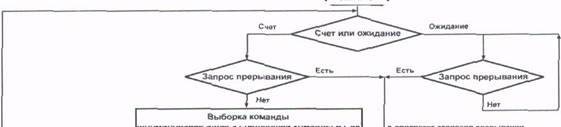 Рабочий цикл начинается с распознавания состояния процессора - «счет» или «ожидание». Далее производится проверка наличия немаскированных прерываний.