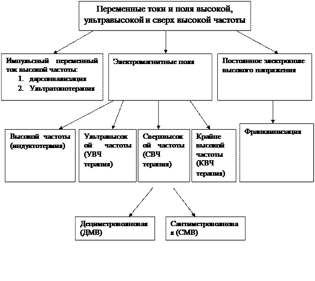 | ВЧ-терапия УВЧ-терапия СВЧ-терапия | 30 кГц-30 МГц 30МГц-300МГц 300 МГц-3000МГц 3000 МГц-30 000 МГц | 10 км-10 м 10м-1м 1м-10см 10см-1см | Токи надтональной частоты Дарсонвализация Индуктотермия э. п. УВЧ ДМВ-терапия СМВ-терапия | ДКВ-2, ИКВ-4 УВЧ-300, «Экран-2» «Импульс-2», «Импульс-3» «Волна-2» «Луч-58» | «Ультратон ТНЧ-10-1» «Искра-1» «Искра-2» УВЧ-66, УВЧ-62, УВЧ-4, «Минитерм» «Ромашка» «Луч-2» | 22 кГц 110 кГц 13,56 МГц 40,68 МГц 460 МГц 2375 МГц |