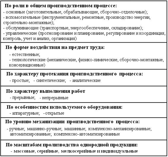 Техническая и организационно-экономическая характеристики производственного процесса определяются видом продукции; объемом производства; типом и видом применяемой техники и технологии; уровнем специализации. Производственные процессы на предприятиях разделяются на 2 вида: основные и вспомогательные.