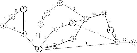 На графике события обозначаются кружками с указанными в них номерами, работы – стрелкой, соединяющей последовательно связанные события. Продолжительность работы обозначается не длиной стрелки, а числом единиц времени, которое указывается над стрелкой (обычно это число дней или месяцев). Внизу под стрелкой указываются затраты на проведение работ (рубли, человеко-дни). Полный путь в сетевом графике – это непрерывная последовательность взаимосвязанных работ и событий, ведущая от начального к конечному событию. Сетевой график позволяет наиболее рационально построить ход выполнения работ, установить строгую последовательность и очередность в выполнении всех необходимых операций и действий. С помощью сетевого графика можно с достаточной точностью определить сроки свершения каждого события и, следовательно, срок достижения результатов завершающего события. Кроме того, применяя сетевой график, можно оптимизировать сроки выполнения завершающего события, выявить и определить влияние различных факторов на сокращение срока каждого мероприятия, организовать контроль, наблюдение и управление действиями отдельных исполнителей.