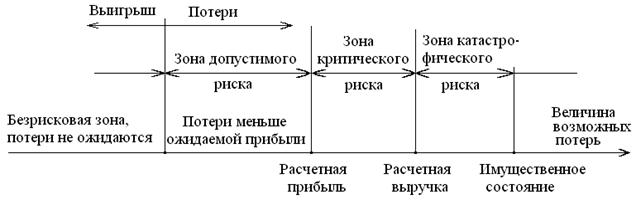 Зона катастрофического риска – область потерь, которые по своей величине превосходят критический уровень и могут достичь величины имущественного состояния предприятия, что нередко приводит к банкротству.