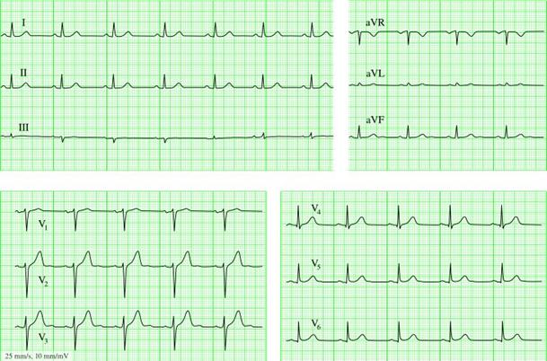 · Поворачивают ручку переключателя отведений на I, отмечают на бумажной ленте "I" (в некоторых моделях электрокардиографов прибор делает это автоматически), регистрируют ЭКГ в течение 3-6 с и переводят прибор в режим ожидания. Аналогичным образом регистрируют ЭКГ в отведениях II, III, aVR, aVL и aVF.