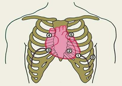 Схема расположения на грудной клетке точек установки микрофона для записи фонокардиограммы (рис. 27): 0 — «нулевая» точка (V межреберье по передней аксиллярной линии слева), 1 — точка, соответствующая примерно верхушке сердца (V межреберье по левой среднеключичной линии), 2 — точка проекции митрального клапана (IV межреберье у левого края грудины), 3 — точка проекции трехстворчатого клапана (IV межреберье у правого края грудины), 4 — точка проекции аортального клапана (II межреберье справа от грудины), 5 — точка проекции клапана легочного ствола (II межреберье слева от грудины).