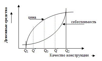 Как изображено на рис. 1.4, часть диаграммы, заключенная между кривой себестоимости и кривой цены изделия и ограниченная точками их пересечения Q1 и Q2, отражает рентабельность и является основанием для существования предприятия. Точку наибольшего отдаления кривых Q0 можно назвать качеством конструкции, обеспечивающим наибольшую прибыль.