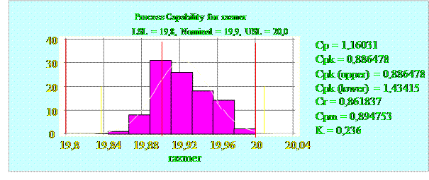 На графике, с правой стороны, представлены ряд коэффициентов, которые могут быть использованы для анализа точности. В частности Ср – коэффициент годности