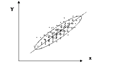 Если точки корреляционного поля группируются вблизи прямой линии, мысленно проведенной в этом поле, то между параметрами имеет место тесная корреляционная связь, рис.3.1.