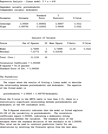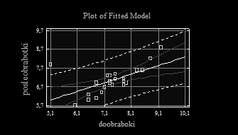 Как следует из распечатки результатов, коэффициент корреляции r = 0,584, что говорит о наличии “умеренно сильной” связи между показаниями. Получено уравнение регрессии. На графике линия регрессии расположена ниже разделительной линии, что говорит о “уменьшающем” действии операции на параметр. Если линия регрессии совпадает с диагональю, из левого нижнего угла в правый верхний, то операция не оказывает влияния на параметр, если проходит выше, то операция оказывает “увеличивающее” влияние на параметр, ниже – “уменьшающее”. Величина коэффициента корреляции 0,584, что говорит о значительном влиянии операции на показатели микросхем. Получено уравнение регрессии, представляющее модель, описывающую изменение параметра в результате операции.