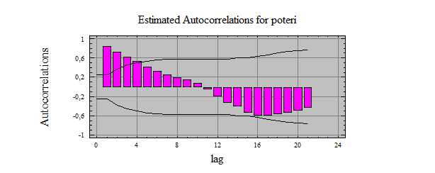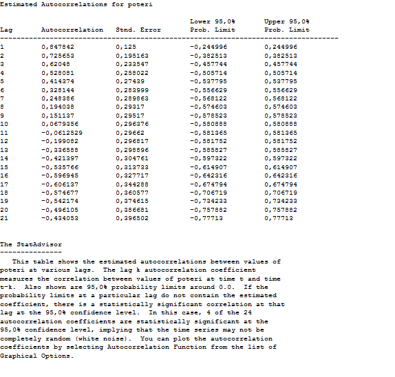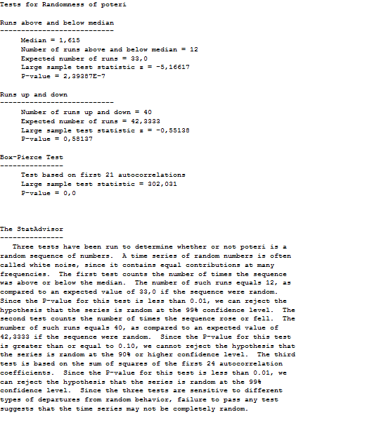 Пример 5.3. Исследовать стабильность технологического процесса производства магнитопроводов. В качестве параметра стабильности использовались измерения потерь (poteri) в магнитопроводе, (Вт/кг). Используем тест рандомизации и автокорреляцию. Текстовые и графические результаты показаны ниже.