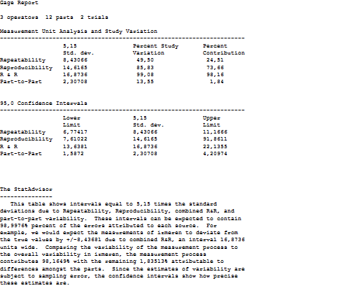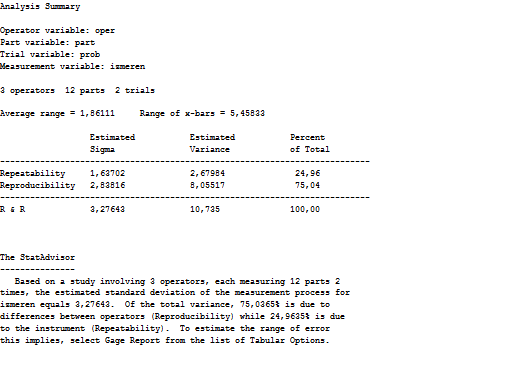 В результате обработки данных определена дисперсия измерений, из представленной распечатки следует, что изменчивость данных на 75% зависит от операторов(воспроизводимость) и на 25% от инструментов