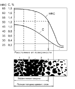 Различают полную и эффективную толщину цементованного слоя. Под полной толщиной понимают всю толщину, в пределах которой содержание углерода уменьшается от максимального на поверхности до исходного в сердцевине.