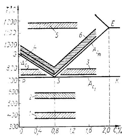 | Рисунок 2. Температурные интервалы различных видов термообработки для сталей: 1 – низкого отпуска 2 – среднего отпуска 3 – отжига, закалки заэвтектоидных сталей 4 – отжига, нормализации, закалки доэвтектоидних сталей, 5 – диффузионного отжига, 6 – нормализации заэвтектоидных сталей |