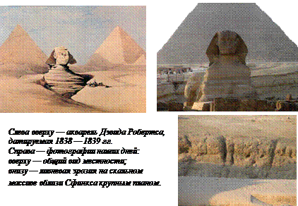 Сфинкс у пирамиды Хеопса в Египте датируется историками-традиционалистами вместе с самими пирамидами возрастом не более пяти тысяч лет. Его плохой вид историки объясняют ветровой эрозией: дули ветры, несли песок, песок и выветривание выскоблило часть материала и т.п. Когда же осмотром Сфинкса занялся профессиональный геолог, то он пришёл к выводу, что Сфинкса длительное время поливали ливневые дожди, и он повреждён водной эрозией, вызванной атмосферными осадками… однако в нынешней цивилизации Сфинкс стоит в одном из самых сухих мест планеты, где редкие дожди не могли вызвать водную эрозию, оставляющую глубокие вертикальные борозды и волнистые горизонтальные канавки, в то время как выветривание и ветровая эрозия оставляют исключительно горизонтальные следы с острыми краями, образуя при этом причудливые формы: скалы-грибы, скалы-зонтики, скалы фигуры и т.п. Кроме того, бόльшую часть своего бытия в эпоху нынешней цивилизации Сфинкс был засыпан песком чуть ли не с головой[41]…