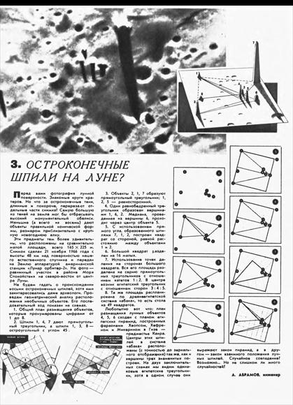 Заглянем в советский научно-популярный журнал «Техника — молодёжи» № 5, 1969 г. В статье «О, эта загадочная Луна» на с. 12 можно увидеть воспроизводимые на следующей странице фотографию и комментарии к ней. Если комментируемая А. Абрамовым фотография лунной поверхности действительно получена с американского космического аппарата «Лунар орбитер 2», а не является первоапрельской шуткой NASA, то запечатлённое на этой фотографии тоже «не лезет» в культовый всемирноисторический миф…
