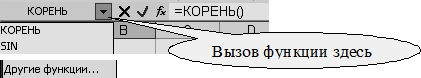 Для вставки в формулу вложенных функций в строке ввода предусмотрена кнопка вызова функций, например: =КОРЕНЬ(SIN(X)); вложенная в =КОРЕНЬ функция SIN вызывается кнопкой (рис.2), которая выдаёт список недавно использовавшихся функций и предлагает вызов Мастера функций (Другие функции).