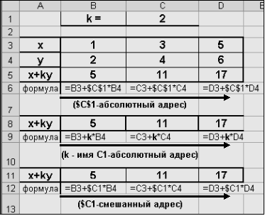 Рис.11а. Пример копирования формулы с абсолютными и смешанными адресами