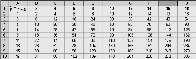 - все значения y, заданные в блоке А2:А10, нужно последовательно умножить на каждое значение х, находящееся в блоке В1: J1, поэтому значения в блоке А2:А10 при копировании по горизонтали (по соответствующим строкам) не должны изменяться, потому фиксируем столбец в адресе $A2.