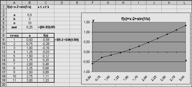 4) Вычислить значения функции f(x) для каждого аргумента х: ввести в ячейку С9 формулу: =B9 – 2 + sin(1/B9);