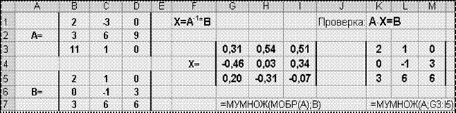 4. Выполнить проверку: А×Х=В: ввести в блок К3:М5 табличную формулу: {=МУМНОЖ(A; G3:I5)}. Решение (матрица Х) верно, т.к. полученная проверкой матрица совпадает с исходной матрицей В.