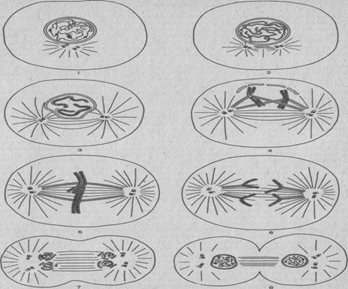 1, 2, 3 — профаза; 4, 5 — метафаза; 6 — анафаза; 7, 8 — телофаза