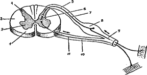 10 — корешок спинно-мозгового нерва, 11 — выносящий (двигательный) нейрон