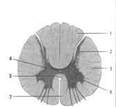 4 — задний рог, 5 — задний корешок спинно-мозгового нерва, 6 — вставочный