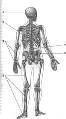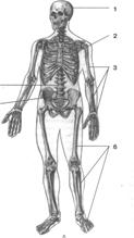 1 — череп; 2 — грудная клетка; 3 — кости верхней конечности; 4 — позвоночный столб; 5 — тазовая кость; 6 — кости нижних конечностей