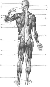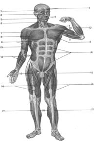 А — спереди: 1 — надчерепная мышца; 2 — височная; 3 — круговая мышца глаза; 4 — круговая мышца рта; 5 — собственно-жевательная; 6 — грудино-ключично-сосцевидная; 7 — дельтовидная; 8 — большая грудная; 9 — зубчатая; 10 — двуглавая; 11 — трехглавая; 12 — сгибатели кисти и пальцев; 13 — косая мышца живота; 14 — прямая мышца живота;