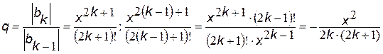 Для любого k было бы нерационально считать входящие в выражения для общего члена степень и факториал с самого начала, имея их значения при предыдущем k. Как степень, так и факториал будут возрастать с ростом k, что может привести к потере точности и/или переполнению разрядной сетки при раздельном их вычислении. Удобнее найти так называемое рекуррентное соотношение, которое устанавливает зависимость между двумя соседними членами ряда в виде коэффициента рекуррентности (q) и в дальнейшем вычислять рекуррентно bk = bk–1q для k = 1, 2,... при очевидном начальном условии b0 = x. Для нашего случая