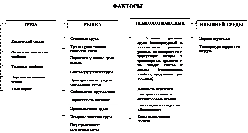 В каждом конкретном случае на состав и величину суммарных затрат будут оказывать влияние факторы процесса доставки (см. рисунок 1.1). Причем влияние одного фактора может привести к улучшению одной группы показателей и к ухудшению – другой. Так, например применение специализированных вагонов сокращает расходы на тару, погрузочно-разгрузочные работы и потери груза, но увеличивает затраты на транспортные операции в связи с большим порожним пробегом и высокой стоимостью этих вагонов.