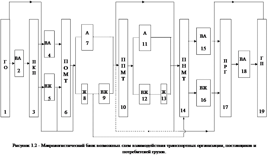 При значительном количестве этапов доставки груза и показателей, входящих в оценочный критерий, для выявления предстоящего объема вычислений рекомендуется для каждого сравниваемого варианта составить модель расчета затрат, в которой следует отразить все этапы доставки груза и перечень учитываемых экономических показателей. Такую модель получают на основе универсальной макрологистической модели-матрицы, состоящей из 34 строк и 20 столбцов (таблица 2.2).