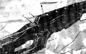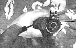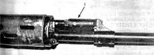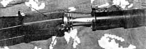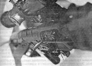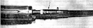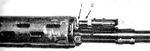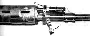 В конструкции СВД предусмотрен газовый регулятор (2 на фото 55). Он необходим для корректирования траектории полета пули по высоте в зимнее и летнее время. Летом положение газового регулятора открытое (7 на фото 57). Зимой, при низких температурах, когда часть энергии порохового заряда расходуется на дополнительный нагрев ствола, положение газового регулятора закрытое (2 на фото 58). В летнем положении (№ 1) открыто боковое отверстие в газовой трубке, и поэтому давление пороховых газов в стволе несколько падает. Соответственно, понижается траектория полета пули. Если летом поставить газовый регулятор в зимнее, закрытое, положение (№ 2), то боковое отверстие в газовой трубке перекрывается, давление в стволе повышается и, соответственно, траектория полета пули повышается. При температуре 25°С превышение траектории полета пули на дистанции 100 м с закрытым регулятором будет на 4 см выше, чем при открытом; при температуре 30°С - на 5 см выше. Зимой при минус 20°С при открытом газовом регуляторе на той же дистанции стрельбы траектория пули будет на 7-8 см ниже, чем при закрытом (зимнем) положении регулятора. Газовый регулятор закрыт и тогда, когда из-за чрезмерного загрязнения газоотводного узла в боевых условиях, при невозможности разобрать и вычистить оружие, автоматика винтовки начинает отказывать. При таком отказе затвор открывается назад вручную, а вперед он доходит усилием возвратной пружины. Установка газового регулятора представлена на фото 59.