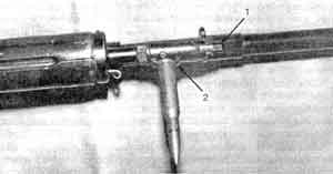 При снаряжении магазина каждый патрон, после того как он будет "вдавлен шляпкой" посреди губок магазина, отводится назад до упора, затем в магазин аналогичным образом "вдавливается" очередной патрон.