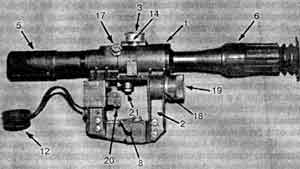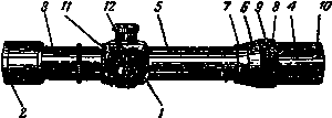 1 - корпус; 2 - оправа объектива; 3 - объективная трубка; 4 - оправа окуляра; 5 - трубка окуляра; 6 - диоптрийное кольцо; 7 - гайка трубки; 8 - кольцо; 9 - стопор; 10 - гайка оправы; 11 - маховичок со шкалой боковых поправок; 12 - маховичок со шкалой дистанций