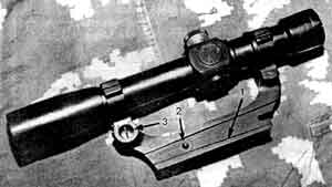 Фото 92. Оптический прицел ПУ (прицел универсальный): 1 - кронштейн прицела
