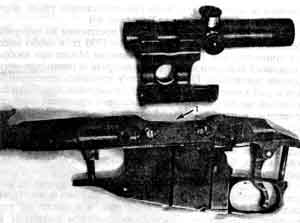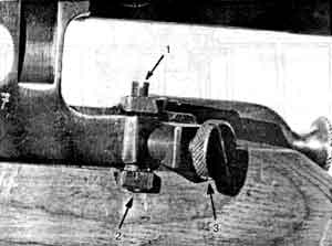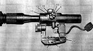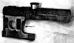 Основание кронштейна крепится к круглой ствольной коробке двумя винтами с мелкой резьбой и фиксируется двумя штифтами для предупреждения осевого смещения. Кронштейн прицела опирается сферической выемкой на шаровую опору основания (1 на фото 94), а его хвостовик находится между микрометрическими винтами установочной регулировки прицела (1, 2 на фото 95). Этими винтами центр зрительного поля прицела выводится на цель по вертикали. Хвостовик кронштейна фиксируется зажимным винтом (3 на фото 94, 3 на фото 95).
