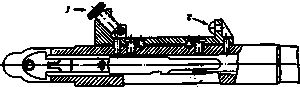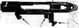 Схема 8. Крепление основания кронштейна прицела ПУ на ствольной коробке 7,62 мм снайперской винтовки 1 - зажимной винт; 2- шаровая опора