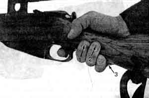 Случается, что палец на тяжелом спуске боевого оружия "не тянет". Это означает, что при захвате правой рукой за шейку ложи или пистолетную рукоятку стрелок что-то "пережал". Если наблюдается такой недостаток, нужно изменить положение кисти правой руки на оружии. Такое положение подбирается индивидуально для конкретного стрелка. Иногда при этом стрелки с короткими пальцами применяют так называемый боковой хват правой рукой без захвата большим пальцем за шейку ложи или пистолетную рукоятку с левой стороны. Ладонь правой руки вместе с большим пальцем плотно приложена к оружию с правой стороны (1 на фото 135). Такое положение правой руки на прикладе считается правильным, но при этом все равно нужно плотно прижимать подушечки среднего и безымянного пальцев с левой стороны приклада!