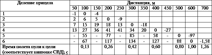 Таблица превышения средних траекторий над линией прицеливания легкой пулей образца 1908 г. при стрельбе из винтовки СВД.